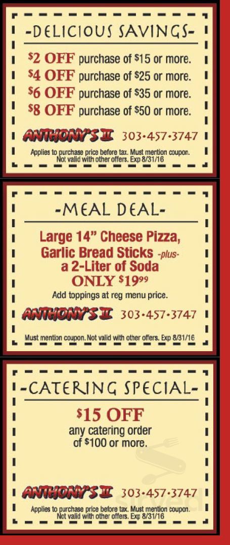 Anthony's Pizza & Pasta | Italian Restaurant - Specialty Pizza Coupon Save money with local coupons for home repair, restaurants, automotive, entertainment and grocery shopping. Anthony's Pizza & Pasta serves Denver's best pizza and Italian food at our locations in Castle Rock and Littleton, CO.